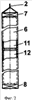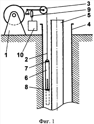 На лебедке 1 (фиг.1) намотан трос 2, который через мерный ролик 3 спускается в пространство между обсадной трубой 4 и насосно-компрессорной трубой 5. К концу троса 2 прикреплен измерительный прибор 6, снабженный замками верхнего груза 7 и нижнего груза 8. Рычаг мерного ролика 3 опирается на датчик натяжения троса 9, соединенный с динамометром 10. В измерительном приборе 6 помещены верхний груз 11 и нижний груз 12 (фиг.2).
