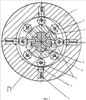 Для изменения производительности волновой пневмогидромашины регулировочному штоку 4 сообщается поступательное вдоль своей оси перемещение. Наклоненные пазы «П» штока 4, взаимодействуя с пластинами-толкателями роликов 8, перемещают ролики 8 в радиальном направлении и тем самым раздвигают спиральное гибкое колесо, что уменьшает объемы полостей всасывания и нагнетания вплоть до нулевого значения.