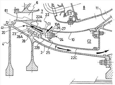 Как видно из чертежа, элементы 22В, 10 и 24 вместе образуют исходную круговую полость С1. Высота этой полости С1 между стенками 22В и 10 определяется высотой крепежного средства 24. Ниже крепежного средства 24 по потоку элементы 22С и 10 стенки образуют между собой вторую полость С2. Этот внутренний кожух создает дополнительное преимущество изоляции воздуха, циркулирующего вблизи ротора.