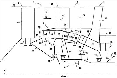 Задний промежуточный картер 2 и второй промежуточный картер 60 подвергаются воздействию осевых и радиальных нагрузок от двух валов 4 и 6. Промежуточный вал 6 установлен в заднем промежуточном картере 2 при помощи упорного подшипника 70 и во втором промежуточном картере 50 при помощи подшипника качения 71. Позицией 72 обозначен упорный подшипник в промежуточном картере 2, в котором установлен приводной вал 73 компрессора 74 высокого давления, расположенного за задним промежуточным картером 2. Между внутренним валом 4 и промежуточным валом 6, по существу напротив упорного подшипника 70 промежуточного вала 6, установлен межвальный подшипник 80, а между внутренним валом 4 и кожухом 63 второго промежуточного картера 60 за подшипником качения 71 установлен упорный подшипник 81.