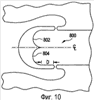 На фиг.10 представлено сечение еще одного геометрического резонатора 800, имеющего несколько поверхностей 802, 804, отражающих волны давления, имеющих цилиндрическую форму. В одном варианте осуществления отражающие поверхности 802, 804 имеют трехмерную конфигурацию, такую, что отражающие поверхности 802, 804 являются сферическими по форме и расположены радиально вокруг центральной линии геометрического резонатора 800. Форма отражающих поверхностей 802, 804 и расстояние D оптимизированы для обеспечения наилучшего восстановления давления волны давления, отраженной от отражающих поверхностей 802, 804, и согласования отраженной волны давления с областью застоя смеси топлива с воздухом в геометрическом резонаторе 800.