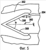 На фиг.5 представлено сечение геометрического резонатора 300 в соответствии с одним вариантом осуществления, используемого в двухступенчатом пульсирующем детонационном устройстве. Также показаны предкамера 302 сгорания и сопло 304 Лаваля. Поверхности 306, 308 геометрического резонатора 300, отражающие волны давления, образуют клиновидную конфигурацию, имеющую угол , что обеспечивает наилучшее восстановление давления волны давления, отраженной от поверхностей 306, 308. Достижение оптимального восстановления давления в отраженной волне давления способствует максимизации детонации смеси топлива с воздухом внутри геометрического резонатора 300. В одном варианте осуществления угол между поверхностями 306, 308 находится в пределах от 45° до 90°. В другом варианте осуществления угол между отражающими плоскостями 306, 308 составляет 55°.