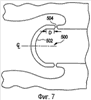 На фиг.7 представлено сечение еще одного геометрического резонатора 500, имеющего поверхность 502, отражающую волны давления, другой параболической формы. В одном варианте осуществления отражающая поверхность 502 имеет трехмерную конфигурацию, такую, что криволинейная отражающая поверхность 502 является радиально вращательной вокруг центральной линии геометрического резонатора 500. Форма отражающей поверхности и расстояние D оптимизированы для обеспечения наилучшего восстановления давления волны давления, отраженной от отражающей поверхности 502, и согласования отраженной волны давления с областью застоя смеси топлива с воздухом в геометрическом резонаторе 500.