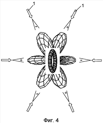 Фиг.4 – схема расположения пар игл устройства согласно изобретению для создания резонансного воздействия на вихри в потоке.