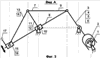 В режиме свободного вращения вала 1 (фиг.3) коромысла 4, 5, 6 совершают вращательно-колебательное движение с определенной амплитудой. Шарнирный параллелограмм от коромысла 4 передает движение по кинематической цепи звеньев 7, 11, 13 на выходное звено – ползун 15, линия движения которого задается положением кулисы 8. Идентичный шарнирный параллелограмм от коромысла 6 передает движение по кинематической цепи звеньев 9, 12, 14 на выходное звено – ползун 15. Обе кинематические цепи имеют одинаковые передаточные функции, поэтому ползун 15 свободно перемещается по кулисе 8.