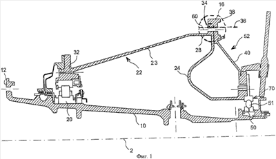 Опора первого подшипника 22 содержит стенку 23, выполненную в виде тела вращения и имеющую в продольном разрезе, по существу, прямолинейный профиль. Эта стенка 23 продолжается в направлении вперед при помощи элемента 32, охватывающего первый подшипник 20. Со своей задней стороны эта стенка 23 связана с конструкцией 16 двигателя посредством классической системы разъединения вращающегося вала, то есть системы разъединения, содержащей только один путь передачи усилий. Для этого стенка 23 завершается фланцем 34, проходящим в радиальном направлении наружу. Этот фланец прикреплен к конструкции 16 двигателя при помощи предохранительных элементов 36, причем весь этот узел определяет предохранительную зону 38.
