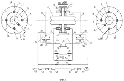 После режима запуска двигателя с повышением частоты вращения вала и давления воздуха от компрессора, при котором обеспечивается нормальное функционирование струйного регулятора, открывается кран 36. При этом, если давление воздуха от компрессора 37 более высокое, чем это требуется, вступает в работу редукционный клапан 38. В магистрали питания воздухом от компрессора предусматривается размещение фильтра 39 для очистки воздуха. Для обеспечения необходимого функционирования газостатического упорно-осевого подшипника с его САУ при применении на объектах с вращающимися валами различной размерности, а также для учета производственных отклонений в размерах, в пределах назначенных допусков, в систему введены дроссели настройки 40, 41, 42, 43, 44, 45, 46.