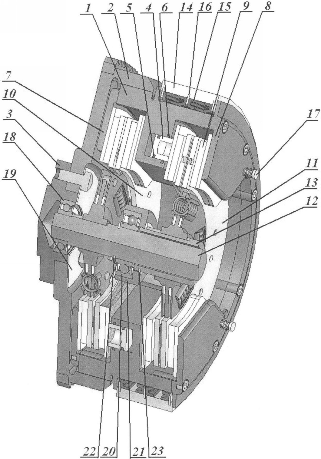Внутри корпуса 1, между приливами корпуса и колец 7 и 8, напротив поршней 4 расположены по три пары ведущих колодок 9, обращенных рабочей поверхностью друг к другу, являющихся элементом передачи крутящего момента на ведомые диски 10 и 11, которые в свою очередь размещены между парами соответствующих колодок 9. Ведомый диск 10 посредством шлицев соединен с внутренним первичным валом 12, а ведомый диск 11 – аналогичным образом с наружным первичным валом 13.