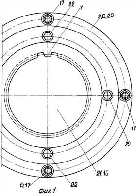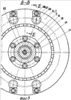 На фиг.6 – сечение В-В на фиг.3, поперечное сечение резьбового конца штока подвижного фланца и неподвижного фланца, размещенных на торце ведущего зубчатого диска пробуксовки ведущей полумуфты.