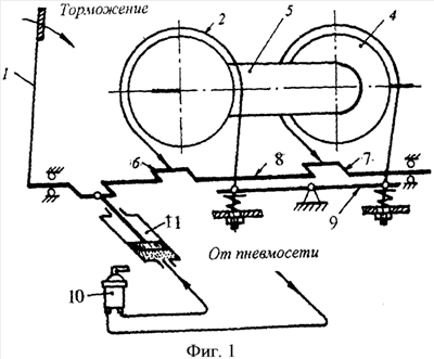 В связи с тем, что весовая нагрузка на набегающую ветвь (I) тормозной ленты 2 увеличилась на величину отношения для ее быстрого отвода от тормозного шкива 4, а также обеспечивая поддержания постоянного зазора между парами трения тормоза наряду с основными подрессорными оттяжками 15 применяют дополнительную 16.