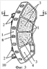 На Фиг.3 – каркас колодки с камерами и фрикционным элементом из цельных вставок, а также окнами на боковой поверхности, вид со стороны рабочей поверхности колодки.