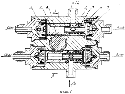 Работает кран следующим образом. Поворот рукоятки штока 6 в положение П2 упрет малый клапан 4 первого канала пружиной в опору 5, освободив этот клапан от бурта втулки 3, и откроет «сброс» в первом канале. Рабочая среда перестанет поступать в П1 и сбросится из него через отверстие во втулке 3 внутри большого клапана 2 между торцами этого клапана и опорой 5, через проток соответствующей опоры, штуцер «сброса» и далее. Одновременно буртом втулки 3 во втором канале отодвинется малый клапан 4 от опоры 5 и через «вход» начнет поступать рабочая среда в П2, закрыв проток большим клапаном 2, упершимся в соответствующую опору 5. При повороте рукоятки штока 6 в положение П1 рабочая среда подается в первый канал, прекратив сброс. Подача рабочей среды во второй канал пресекается, производится ее сброс.