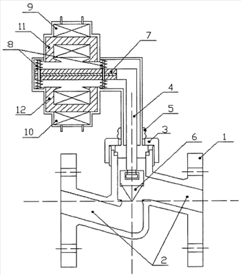 Электромагнитный клапан работает следующим образом. Корпус 1 через патрубки 2 соединяется с трубопроводом с рабочей средой. Крышка 3 ограничивает движение штока 4. Уплотнительные кольца 5 предохраняют от утечек рабочей среды. Шток 4 с закрепленным плунжером 6 совершают возвратно-поступательные движения, задаваемые якорем 7. Положение якоря зависит от намагничивающей силы на катушках 9, 10. При подаче одинакового значения напряжения на намагничивающие катушки 9, 10 якорь 7 под действием одинаковых электромагнитных сил располагается посередине. Плунжер 6 занимает среднее положение как показано на чертеже. Пропускная способность электромагнитного клапана уменьшается в два раза. При увеличении значения напряжения на намагничивающей катушке 10 и пропорциональном уменьшении значения напряжения на намагничивающей катушке 9 электромагнитная сила, создаваемая намагничивающей катушкой 10, увеличивается и притягивает якорь 7 вниз. Шток 4 с плунжером 6 перемещаются вниз и постепенно перекрывают патрубки 2. Пропускная способность электромагнитного клапана уменьшается. Если значение напряжения на намагничивающей катушке 10 не увеличивать, то якорь 7 остается в промежуточном положении. Дальнейшее увеличение значения напряжения на намагничивающей катушке 10 до максимального приводит к тому, что шток 4 с плунжером 6 перекрывают патрубки 2. Электромагнитный клапан закрыт, а рабочая среда не поступает в трубопровод. При увеличении значения напряжения на намагничивающей катушке 9 возникает электромагнитная сила, притягивающая якорь 7 вверх. Шток 4 с плунжером 6 открывают патрубки 2, а поток рабочей среды увеличивается. Дальнейшее увеличение значения напряжения на намагничивающей катушке 9 до максимального приводит к тому, что шток 4 с плунжером 6 полностью открывают патрубки 2, электромагнитный клапан открыт, а рабочая среда поступает в систему в полном объеме. Таким образом происходит регулирование потока рабочей среды. Залипание якоря 7 предотвращается пружинами 8. Якорь 7 изготовлен из прослойки из немагнитного материала со вставками из магнитомягкого материала. Такая конструкция якоря 7 позволяет разделить магнитные потоки, а также уменьшить массу и габариты электромагнитного клапана в целом. Когтеобразная форма магнитопроводов 11, 12 увеличивает площадь взаимодействия и величину намагничивающей силы.