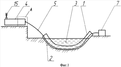 Устройство (см. фиг.2) содержит кожух 1, ранее проложенный по дну 2 водоема 3, трубопровод 4, тяговый трос 5, один конец которого соединен с оголовком 6, а другой с тяговым механизмом 7, области избыточного давления воздуха (ресивер) 8, заливочную трубу 9, запорное устройство 10 с дистанционным приводом 11, обратный клапан 12, промежуточную заглушку 13, концевую заглушку 14, вантуз 15, опорный ролик 16, установленный на наружной поверхности в верхней образующей головной части трубопровода 4.