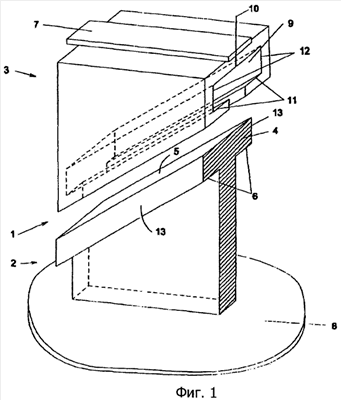 Можно использовать другие средства для взаимного зацепления элементов 2, 3, препятствуя их разделению перпендикулярно наклонной поверхности. Предпочтительное средство взаимного зацепления, такое, как показано на фиг.1, непосредственно взаимно зацепляет элементы 2, 3. Другое подобное средство могло бы включать в себя, например, Т-образные наклонные поверхности не только для элемента 2, но также и для элемента 3, фланцы, выступающие наружу из каждого скатного элемента 4, и зацепляемые с возможностью скольжения U-образные элементы, входящие во взаимное зацепление с фланцами элемента 2 и фланцами элемента 3. Менее предпочтительное средство взаимного зацепления может быть опосредованно соединено с элементами 2, 3, например, стяжка, наклонно расположенная между конструкцией стенки или верха 7 и окружающей опорной конструкцией 8 и с возможностью поворота прикрепленная к ним для удерживания элементов 2, 3 вместе, но при необходимости поворачиваться, с тем чтобы не препятствовать перемещению вдоль наклонной поверхности элемента 3 относительно элемента 2. При установке U-образных дополнительных элементов или при установке стяжки или другого опосредованно присоединяемого дополнительного элемента, осуществляется эффективное взаимное зацепление элементов 2, 3.