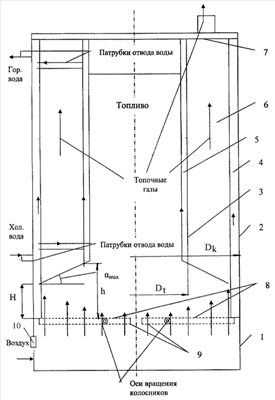 Величина зазора между колосником 8 и нижней кромкой топливной трубы 3 определяется максимальным значением угла естественного откоса топлива с учетом минимально допустимой толщины слоя топлива вблизи внутренней стенки цилиндрического корпуса 2, то есть соотношением , где h – величина зазора между колосником 8 и нижней кромкой топливной трубы 3; Dk – диаметр цилиндрического корпуса 2; Dt – диаметр топливной трубы 3; max – максимальный угол естественного откоса топлива (например, для каменного угля 40°, для опилок 45° и т.д), Н – минимально допустимая толщина слоя топлива вблизи внутренней стенки цилиндрического корпуса 2, составляющая не менее Dt/4.
