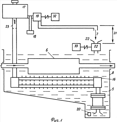 Синхронно блок управления 26 откроет электроклапан 18, и рабочая жидкость 5 под давлением поступит в гидротурбину 19, вращающую якорь электрогенератора 32, а затем в виде движущегося свободнопадающего потока рабочей жидкости 5, преодолев расстояние 21, поступит в гидротурбину 22, вращающую якорь электрогенератора 33. Пройдя через нее, жидкость 5 поступает в емкость 8.