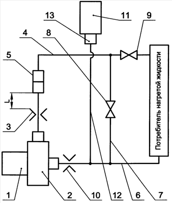Установка между прямым и обратным трубопроводами трассы трубопроводной перемычки с вентилем и дополнительного вентиля после перемычки в прямом трубопроводе позволяет перераспределить поток нагреваемой жидкости и организовать дополнительный контур, предназначенный для более высокого поднятия температуры жидкости перед ее поступлением к потребителю за счет многократного прокачивания через теплогенератор.