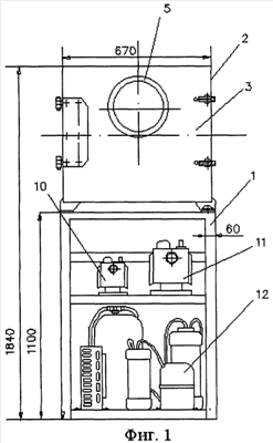 Устройство состоит из корпуса 1, рабочей камеры 2 с дверцей 3 для загрузки-выгрузки противней с продуктом и дополнительной дверцей 4, размещенной с противоположной стороны от имеющейся, дверцы оснащены смотровыми окнами 5, 6. Рабочая камера 2 содержит конденсатор водяных паров 7, установленный вертикально в центральной ее части с горизонтально расположенными оребренными трубками, десублиматор 8 с горизонтальными плитами, нагревательное устройство 9, представляющее собой систему плоских экранированных электронагревателей, вакумные насосы 10, 11, низкотемпературную холодильную машину 12, среднетемпературную холодильную машину 13; загрузка-выгрузка противней 14 с продуктом 15 осуществляется с двух торцевых противоположных сторон; противни 14 и нагревательное устройство 9 располагаются в пазах металлического съемного каркаса 16, установленного на рабочей поверхности тензовесов 17.