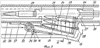 4. Устройство по п.1, отличающееся тем, что постоянный горизонтальный однорядный промежуточный коробчатый магазин содержит нижнее входное окно, выполненное с возможностью стыковки с упомянутым верхним патронным выходом основного магазина, осуществляемой в заднем фиксированном положении подвижного стреляющего агрегата оружия, а также желобообразную криволинейную в профильном сечении стенку наружной, обращенной от патронника, торцевой части корпуса промежуточного магазина, которая выполнена с возможностью изменения на 90° траектории движения патронного ряда, поперечно перемещаемого из вертикального основного магазина в горизонтальный промежуточный магазин относительно профильного сечения описываемого устройства, также имеются загибы патронного выхода, служащие для поперечного удержания верхнего патрона промежуточного магазина и снабженные продольной прорезью, служащей для прохода выступа затворного узла досылающего данный патрон в патронник, на верхней боковой стенке промежуточного магазина размещена поперечная секторная прорезь, служащая для прохода казенного фигурного выступа упомянутого рычажного подавателя патронов для промежуточного магазина, на нижней боковой стенке промежуточного магазина с внешней стороны нижнего входного окна последнего выполнен косоразмещенный выступ, обращенный вниз, отпирающий патронный выход основного магазина, выполненный с возможностью воздействия на вышеупомянутый пружинный выталкиватель верхнего патрона основного магазина, также косоразмещенный на оружии относительно горизонтальной проекции описываемого устройства, причем имеется другой выступ, утапливающий верхний патрон основного магазина, размещенный также на нижней боковой стенке промежуточного магазина у казенной части нижнего входного окна последнего с возможностью при перемещении вперед подпружиненного стреляющего агрегата оружия, одновременного прохождения данного выступа через упомянутую казенную прорезь и далее верхний патронный выход основного магазина мимо верхнего внутреннего выема последнего с возможностью обратного поперечного перемещения упомянутого верхнего патрона, находящегося между нижним входным окном промежуточного магазина и верхним патронным выходом основного магазина, в упомянутый фиксирующий данный патрон верхний внутренний выем последнего, причем данное обратное перемещение осуществляется совместно с упомянутой вертикальной пружиной изгиба, верхний вилкообразный торец которой размещен ниже выступа, утапливающего верхний патрон, с возможностью воздействия на боковую поверхность гильзы верхнего фиксируемого патрона, а также имеется составляющая нижнюю боковую стенку корпуса промежуточного магазина пластина с пружинящими язычками, выполненными с возможностью тормозящего воздействия на гильзы патронов, поперечно перемещаемых из основного в промежуточный магазин, с возможностью упреждения осевого перекоса данных патронов.