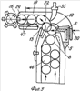 Устройство подачи боеприпасов работает следующим образом, фиксация основного магазина 3, устанавливаемого в свой приемник 15, осуществляется посредством имеющихся дульного зацепа 16 и казенного опорного выступа 17 для подпружиненной защелки 18 данного магазина. Причем основной магазин размещается позади одной из двух пистолетных рукоятей 43 оружия, с некоторым поворотом своей пульной передней поверхности к патроннику 28, а также размещаясь сбоку от проходящего между упомянутыми рукоятями нижнего продольного эжекционного окна 44. При этом снабженный пружинным возвратным механизмом 41 стреляющий агрегат оружия /28, 32, 19/ посредством имеющейся рукояти затворного узла 42, одновременно служащей для отведения в заднее фиксированное положение данного стреляющего агрегата, переводится в данное заднее положение, при котором данный агрегат автоматически фиксируется внутри своего направляющего ложа 39 посредством имеющегося фиксатора заднего положения стреляющего агрегата 1, выполненного с возможностью своего ручного отключения, посредством своего флажка 2. Причем при установке на оружие данного основного магазина 3 емкостью 30 патронов его дульный зацеп 16 служит упором для нижнего поперечного выступа 34, для отведения /отключения/ подпружиненного рычажного подавателя патронов 33, 36, казенный фигурный выступ 36 которого при этом выходит к наружному торцу бокового корпуса однорядного промежуточного магазина 19, емкостью 3-4 патрона, за пределы нижнего входного окна 21, которое стыкуется с верхним патронным выходом 9 основного магазина, для поперечного перемещения патронов 46 в промежуточный магазин, также размещенный на промежуточном магазине, выступ, отпирающий патронный выход основного магазина 20, воздействует на пружинный выталкиватель патрона 6, который выталкивает из внутреннего желобообразного выема 10 верхний патрон, находящийся, как и другие патроны, под воздействием подпружиненного подавателя патронов /основного магазина/ 7. Вследствие этого поперечно перемещающийся из однорядного патронного выхода 9 во внутрь корпуса промежуточного магазина 19, нижнее входное окно 21 которого состыковано с данным патронным выходом, а торцевая криволинейная стенка 22 обеспечивает поперечное перемещение патронов из вертикального основного магазина 3 вовнутрь горизонтального промежуточного магазина 19, с изменением траектории их поперечного перемещения на девяносто градусов /на фиг.5, показано стрелкой/, причем размещенная на нижней боковой стенке промежуточного магазина 19 пластина с пружинными язычками 47, воздействующими на боковые поверхности патронов 46, упреждает их осевой перекос внутри данного магазина, до момента упора верхнего патрона на загибы 24, которые имеет патронный выход 25 промежуточного магазина, причем имеющаяся между данными загибами продольная прорезь 26 обеспечивает проход выступа затворного узла 27, досылающего данный патрон в патронник 28 упомянутого стреляющего агрегата оружия. Причем, режимы стрельбы: непрерывный и одиночный огонь, осуществляются в заднем фиксированном положении стреляющего агрегата, фиксированная очередь /из трех-четырех выстрелов/ осуществляется из переднего положения данного агрегата посредством отключения упомянутого фиксатора 1, имеющего вилкообразный флажок 2 /данное предлагаемое изобр