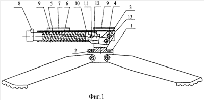 Перед стрельбой оружие (условно не показано) устанавливается в направляющие 9 люльки 5 и закрепляется выступом 8 штока 6. При этом происходит поджатие пружины 7 при действии на заднюю часть подвижной втулки 10, ограниченной от перемещения через цапфу 11 рычагом 12. Усилие поджатия пружины обеспечивает уравновешивание массы оружия с люлькой 5 относительно оси вращения 4. При возвышении люльки 5 происходит приближение центра тяжести оружия с люлькой по горизонтали к оси 4 и уменьшение величины момента тяжести относительно оси 4. Одновременно за счет разности в положениях оси 4 и оси 13 опорная часть вилки рычага 12 приближается к оси 4, а втулка 10 с цапфой 11 под действием пружины 7 смещается назад. Происходит уменьшение поджатия пружины 7 соответственно уменьшению момента сил тяжести оружия с люлькой, происходит уравновешивание оружия с люлькой на всех углах возвышения и склонения оружия. После придания оружию необходимого угла возвышения или склонения стопорение люльки с оружием осуществляется известным устройством в составе механизмов вертикального наведения. При выстреле оружия короб оружия, связанный со штоком 6 посредством выступа 8, перемещается назад. Шток 6 сжимает пружину 7, задний конец которой упирается во втулку 10, удерживаемую рычагом 12 через цапфу 11 в неподвижном состоянии. Пружина 7, сжимаясь и разжимаясь после выстрела, амортизирует откат оружия и возвращает его в исходное положение перед очередным выстрелом. Характеристики пружины 7 и расстояние между осями 4 и 13 выбираются конструктивно исходя из энергии отдачи оружия и его веса.
