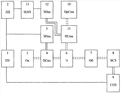 На чертеже одинарной линией показаны электрические связи, двойной сплошной – механические связи, двойной пунктирной – оптические связи.