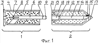 Передняя часть выстрела 2 включает в себя ракетный ускоритель и переднюю секцию бронебойного стержня 11, расположенную по оси ускорителя. Ускоритель содержит корпус 12 с дном – сопловым блоком 13 и зарядом твердого топлива 14. В головной части корпуса расположен блок включения 15 траекторного воспламенителя 16 заряда с приемником временной установки 17. В задней секции стержня расположен глухой канал 18 с заходной конической частью 19.