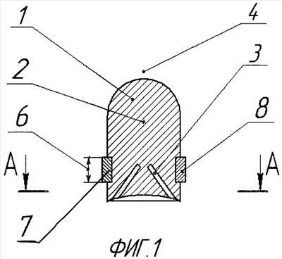 Предлагаемое изобретение поясняется чертежами, где на фиг.1 изображен продольный разрез пули; на фиг.2 – размещение пули в гильзе патрона; на фиг.3 – сечение А-А.