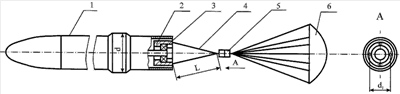 Отделяемая головная часть состоит из корпуса 1, донного вертлюга 2, снабженного радиально-упорным подшипником 3, гибких связей 4 в количестве не менее трех, выносного вертлюга 5, парашюта 6. Узлы крепления гибких связей 4 к донному вертлюгу 2 удалены от оси корпуса 1 и расположены на окружности с диаметром d1=(0,5 1,0)d,, а на расстоянии L=(l,0 2,0)d от узлов крепления гибкие связи 4 скреплены между собой, где d – калибр головной части.