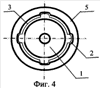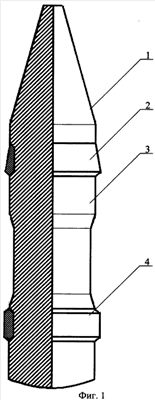 В состав конструкции такого снаряда входит наконечник баллистический (1), устройство компенсации температурного расширения канала ствола (2), центрирующее утолщение (3), медный ведущий поясок (4). Предлагаемый элемент конструкции предназначен для повышения живучести стволов ААО, повышения точности стрельбы и работает следующим образом. При выстреле после срабатывания капсюля-воспламенителя происходит воспламенение порохового заряда патрона. Под действием сил давления пороховых газов снаряд совершает поступательное движение вдоль канала ствола (5). При этом (фиг.3) устройство компенсации температурного расширения канала ствола (2) и основной ведущий поясок (4) снаряда врезаются в нарезы канала ствола (5) (фиг.4), преодолевая силу реакции боевых граней и силу трения. Устройство компенсации температурного расширения канала ствола имеет форму кольца с фасками, внешний диаметр которого больше калибра снаряда (внешнего диаметра центрирующего утолщения) и соответствует диаметру ствола при его максимально допустимом в процессе эксплуатации температурном расширении и износе. Устройство компенсации температурного расширения канала ствола (2) равномерно заполняет пространство между центрирующим утолщением (3) и поверхностью канала ствола (5) (фиг.4), центрирует снаряд при его продвижении по каналу ствола (5) (фиг.3) и устраняет ударные поперечные нагрузки, возникающие при воздействии его центрирующего утолщения на внутреннюю поверхность канала ствола (5). Устройство компенсации температурного расширения канала ствола (2) выполняет также роль обтюратора и дополнительно с основным ведущим пояском (4) устраняет прорыв пороховых газов из заснарядного пространства, повышая эффективность их работы.