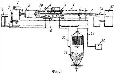 Данный способ осуществляется в известном из того же патента устройстве, содержащем привод вращения заряда, нагнетательное устройство, подающий трубопровод, на конце которого установлен ускоряющий насадок с возможностью вертикального и горизонтального перемещения от приводов, поддон для сбора измельченной крошки. Недостатком известного способа и установки является невозможность извлечения заряда ВВ из БП, диаметр горловины корпуса которых значительно меньше, чем калибр БП, и невозможность извлечения заряда ВВ из корпусов БП, не имеющих центрального канала, что обусловлено конструкцией ускоряющего насадка.