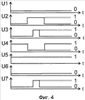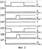 Затем контролируемое изделие 20, оставляя фотоприемник 7 (6) в засвеченном состоянии, выходит из зоны действия электромагнитного поля 19. В результате генератор 4 продолжает находиться в исходном состоянии вследствие отсутствия внесения контролируемым нагретым неметаллическим изделием 20 существенного затухания в его колебательный контур. В связи с этим описанные состояния схемы устройства в остальных ее точках и диаграмм напряжений на фиг.3, установившиеся до момента выхода контролируемого изделия 20 из зоны действия электромагнитного поля 19, не изменились. Поэтому на выходных клеммах 13 и 11 продолжают оставаться соответственно напряжения U6 и U7 с уровнями логического “0”.