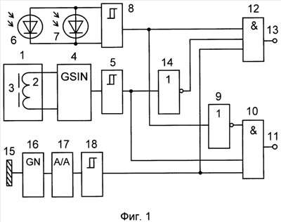 Устройство содержит (см. фиг.1) индуктивный чувствительный элемент 1, выполненный в виде катушки индуктивности 2, помещенной со стороны открытого торца чашки ферритового сердечника 3 с центральным отверстием в ее кольцевом пазу, высокочастотный генератор электрических колебаний 4, выполненный, например, по схеме автогенератора с индуктивной трехточкой, причем выходы индуктивного чувствительного элемента 1 подключены к цепям его колебательного контура, первый пороговый элемент 5, выполненный, например, по схеме триггера Шмитта, вход которого подключен к выходу высокочастотного генератора электрических колебаний 4, первый и второй инфракрасные фотоприемники 6, 7, включенные между собой параллельно, формирователь импульсов 8, выполненный, например, по схеме триггера Шмитта, ко входу которого подключены выходы инфракрасных фотоприемников 6, 7, первый инвертор 9, вход которого соединен с выходом формирователя импульсов 8, первый логический элемент 3И 10, первый вход которого соединен с выходом первого порогового элемента 5, первую выходную клемму 11, подключенную к выходу первого логического элемента 3И 10 и являющуюся первым выходом устройства, второй логический элемент 3И 12, вторую выходную клемму 13, соединенную с выходом второго логического элемента 3И 12 и являющуюся вторым выходом устройства, второй инвертор 14, вход которого подключен к выходу первого порогового элемента 5, выход – к первому входу второго логического элемента 3И 12, емкостной чувствительный элемент 15, последовательно включенные мультивибратор 16, к входу которого подключен емкостной чувствительный элемент 15, выполненный, например, по схеме симметричного автогенератора прямоугольных импульсов на основе операционного усилителя (см. книгу Шило В. Л. Линейные интегральные схемы в радиоэлектронной аппаратуре. – М.: Сов. радио, 1974, с.175, рис.4.42, а), детектор 17, выполненный, например, по схеме диодного пассивного преобразователя амплитудных значений переменного напряжения в постоянное с последовательным включением выпрямительного диода с выходной нагрузкой в виде параллельной RC-цепи (см. книгу Волгин Л.И. Измерительные преобразователи переменного напряжения в постоянное. М.: Сов. радио, 1977, с.174, рис.4.9, б), второй пороговый элемент 18, выполненный, например, по схеме триггера Шмитта, выход которого соединен со вторыми входами первого и второго логических элементов 3И 10 и 12, третьи входы которых подключены соответственно к выходам первого инвертора 9 и формирователя импульсов 8.
