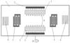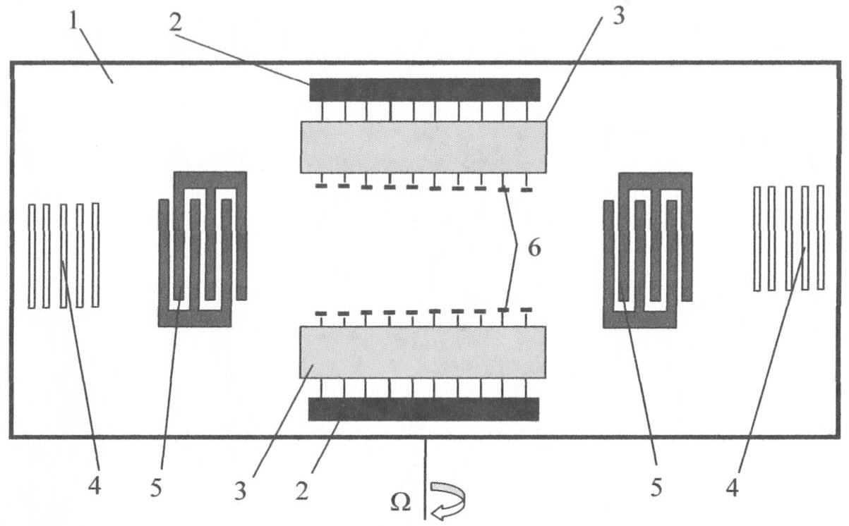 Отражающие структуры 4 расположены за ВШП 5 драйвера ПАВ, а электроды чувствительного элемента разности потенциалов 6, поглотители акустических колебаний 3 и контактные шины 2 – между другими двумя противоположными краями пьезопластины 1 вдоль направления распространения первичной ПАВ. Поглотители акустических колебаний 3 выполняют функции поглощения ПАВ так, чтобы поверхность пьезопластины 1 за поглотителями акустических колебаний была нечувствительной к ПАВ, создаваемым ВШП 5 драйвера ПАВ, что позволяет аккумулировать на одной контактной шине потенциалы, одновременно сформированные на электродах чувствительного элемента разности потенциалов 6 под действием сил Кориолиса одного направления.
