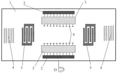 Основанием электронного гироскопа на ПАВ служит прямоугольная пьезопластина 1, выполненная из пьезоэлектрика или пьезополупроводника, например из кварца, ниобата лития или из CdS, CdSe, слоистой структуры LiNbO3 – Si соответственно [1].