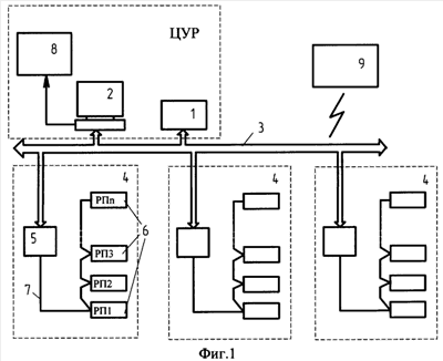 Сетевые коммуникационные устройства, включающие модемы, коммутаторы сетевых соединений и т.д., обеспечивают связь по сетевым протоколам между комплексным серверным устройством 1, рабочей диспетчерской станцией 2, локальными серверами 5 и рабочими станциями сторонних пользователей 9, среди которых может быть центральный диспетчерский пункт (сервер единой базы данных) отрасли.