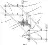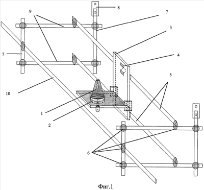 Нивелир 1 устанавливают в подставку 2 и фиксируют неподвижно в ее верхней части 14, которая может вращаться относительно нижней части 13, имеющей разградуированную шкалу для измерения угловых перемещений. Подставку 2 крепят к струбцине 3 винтом 12, нижняя часть 13 подставки 2 неподвижна относительно струбцины 3. Винтом 11 фиксируют положение Г-образной части струбцины в необходимом положении. Струбцину 3 через металлические скобы 4 с помощью винтовых соединений присоединяют к поперечным трубам 5. Для крепления устройства к транспортному средству в вертикальных трубах 7 выполнены отверстия, к которым через болтовое соединение прикреплена пластина 8. Для осуществления измерений фиксацию устройства к транспортному средству производят с помощью резьбовых отверстий для установки ремней безопасности (могут быть, например, использованы болты крепления ремней безопасности). Возможно также крепление устройства к транспортному средству болтами подходящей длины через отверстия в вертикальных трубах 7. Поперечная труба 10, установленная в оконных проемах транспортного средства, дополнительно фиксирует устройство под действием силы тяжести.