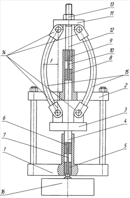 Устройство работает следующим образом. Предварительно образцы 7 и 10 устанавливают соответственно в захватах 5, 6 и 8, 9, и пассивные захваты 5 и 8 жестко фиксируют. Затем устанавливают нижнюю подвижную траверсу 3 таким образом, чтобы ее толкатель 4 вошел в контакт с активным захватом 6 образца 7, после чего в шарнирных захватах 14 нижней 3 и верхней 11 подвижных траверс устанавливают образцы 15. После этого, завинчивая гайку 13 ходового винта 12, нагружают расчетной нагрузкой образцы 15 до потери ими устойчивости и достижения расчетного прогиба, при этом реакция упруго изогнутых образцов через верхнюю подвижную траверсу 11 и ходовой винт 12 передается на активный захват 9 образца 10, создавая растягивающую нагрузку, а через нижнюю подвижную траверсу 3 и толкатель 4 – на активный захват 6 образца 7, создавая нагрузку на сжатие. После этого проводят контрольное измерение величины нагрузки, для чего толкатель измерителя 16 вводят в контакт с захватом 5 и снимают его с фиксатора (не показан), измеряют напряжение, фиксируют захват 5, убирают измеритель 16 и фиксируют время начала испытаний.
