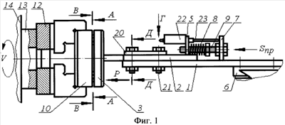 На другом торце подвижной плиты 2 на упоре 5 установлен индикатор 22 часового типа с щупом 23. При контакте щупа 23 с упором 7, расположенным на основании 1, стрелка индикатора 22 отклоняется, определяя величину перемещения подвижной плиты 2 относительно основания 1. Между упором 5 подвижной плиты 2 и упором 7 основания 1 установлена пружина 8, сжатие которой предварительно тарируется в зависимости от величины прикладываемой силы Р. В результате продольного перемещения основания 1 с помощью привода возвратно-поступательного движения (не показан) своим упором 7 будет воздействовать через пружину 8 на подвижную плиту 2, поджимая закрепленный на ней держатель 3 с образцами 4 к обкатнику 10. Центрирование пружины 8 осуществляется с помощью регулировочного болта 9, с одной стороны закрепленного на упоре 7 основания 1, а с другой – свободно перемещающегося в отверстии упора 5 подвижной плиты 2.