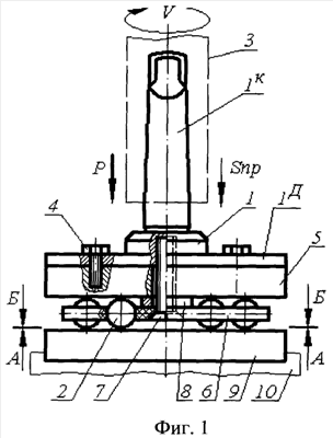 Испытания осуществляются следующим образом. Через конус 1к обкатника 1 верхний образец 5 за счет вертикального перемещения Sпр шпинделя 3, например, вертикально-сверлильного станка поджимается через деформируемые тела 2, установленные в сепараторе 6, к нижнему образцу. Сила прижима Р должна быть предварительно тарирована и пропорциональна силе нажатия на рукоятку продольного перемещения шпинделя станка, которая регулируется подвешиваемыми к ней грузами (не показаны). Включается вращение шпинделя с заданной частотой V, при этом деформируемые тела совершают круговое обкатывающее движение по поверхности верхнего и нижнего образцов.