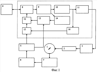 Запуск устройства производится с помощью компьютера 4. Необходимые условия эксперимента: диапазон измерения, ширина окна, число событий задаются посредством пользовательского интерфейса программы. Далее процесс измерения автоматизирован и протекает по алгоритму (фиг.4). В зависимости от заданных параметров программа через буфер обмена данными 8, соединенный с компьютером 4 через внешний порт (corn, USB, LPT, ), записывает соответствующие значения в управляющие регистры 9. После записи регистров сигнал, соответствующий определенному значению сдвига окна, подается в блок формирования окна 14. После формирования задержанного окна сигнал подается на схему отбора событий 13, управляющую работой АЦП 12. С управляющих регистров 9 на формирователь 10 подается сигнал “старт”. Далее сигнал “старт” раздваивается и подается с определенной задержкой 16 на ВАП 15 и на импульсный усилитель 11, так как для устойчивой работы тиристорной структуры запуска рентгеновской трубки 3 необходимо привести стандартный ТТЛ (транзисторно-транзисторная логика) сигнал к необходимому виду с заданными параметрами амплитуды, длительности фронтов и самого импульса.