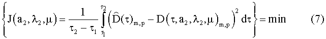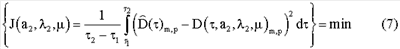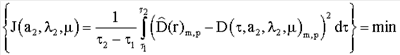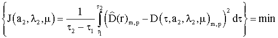 * – длительность теплового воздействия; µ – координата глубины залегания скрытого объекта; J – функционал невязки; Т( , а1, 1, а2, 2, µ) – значение избыточной температуры, рассчитанное математической моделью с учетом сеточной модели скрытого объекта; D( , a2, 2, µ) – дифференциальная термограмма на поверхности грунта, рассчитанная математической моделью;