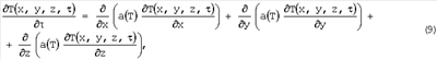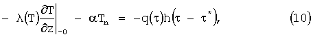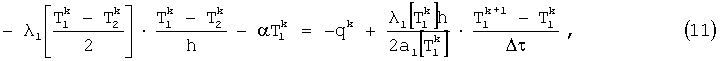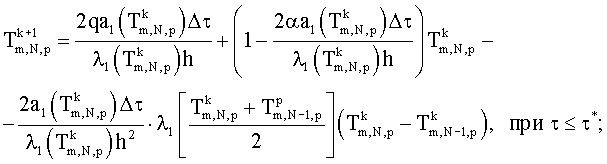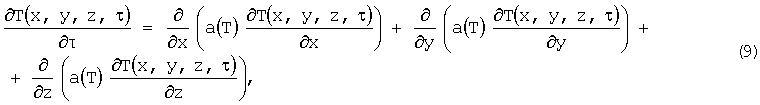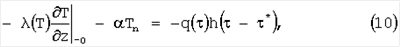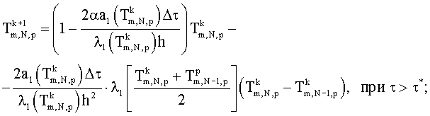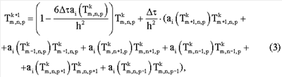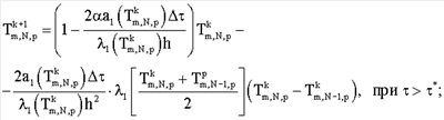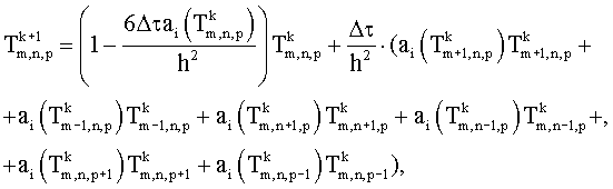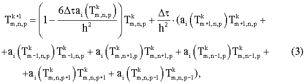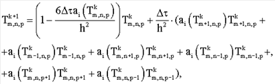 Нелинейную задачу теплопроводности (9) при граничных условиях (10) решают методом конечных разностей. Разностная схема для трехмерного уравнения теплопроводности имеет вид (3). Граничные условия аппроксимируют на основании выражения: