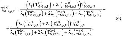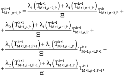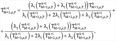 при i=1,    рассчитывают численную модель скрытого объекта с теплофизическими свойствами {а2, 2}, расположенного между точками [М-1, µ, P] и [M+1, µ, P] на глубине залегания µ, в граничной точке [М+2, µ, P]: