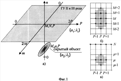 На фиг.1а) представлена пространственная сетка первой и второй математической модели. На фиг.1б), в) представлена пространственная сетка скрытого объекта для второй математической модели.