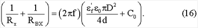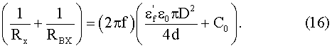 где 1/Rx – активная проводимость первичного преобразователя, 1/RВХ – активная проводимость измерительной системы, k – постоянная Больцмана, – частота измерений,  – полоса частот, 0 – электрическая постоянная, D – диаметр дисковых электродов первичного преобразователя, d – толщина образца полимера, С0 – емкость измерительной системы,  f – диэлектрическая проницаемость полимера, определенная без воздействия на испытуемый образец внешнего электромагнитного поля.