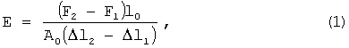 где F2 – нагрузка, соответствующая относительному удлинению 0,3%; F1 – нагрузка, соответствующая относительному удлинению 0,2%; l0 – расчетная длина образца; А0 – площадь начального поперечного сечения образца; l2 – удлинение, соответствующее нагрузке F2; l1 – удлинение, соответствующее нагрузке F1.