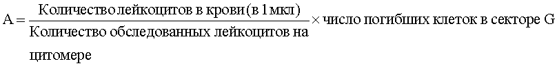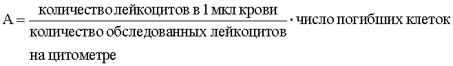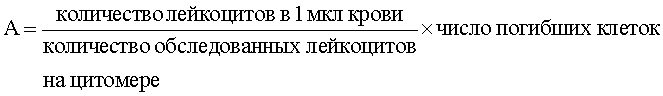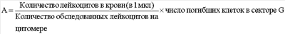 Способ оценки степени тяжести эндогенной интоксикации путем исследования форменных элементов периферической крови, отличающийся тем, что в венозной крови больного определяют количество лейкоцитов с помощью моноклональных антител к рецептору CD45, а затем в автоматическом режиме на проточном цитометре с помощью ДНК-специфического красителя 0,005%-ного раствора 7 амино-актиномицина D (7AAD) определяют количество погибших клеток, рассчитывают абсолютное число погибших лейкоцитов (А) в единице объема крови по формуле