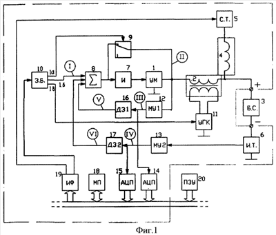 В режиме регистрации световых характеристик при включении осветителя при выходе ламп на режим ( 0,5-1,0 сек) в цепи солнечной батареи 3 и последовательно включенных с ней звеньев 1, 2 и 6 устанавливается ток короткого замыкания Iк.з. (постоянная времени ламп осветителя много больше постоянных времени дифференцирования реального звена скоростной обратной связи 17 и на исходное состояние схемы влияния не оказывает). Сопротивление, приведенное ко вторичной обмотке понижающего широкополосного высокочастотного трансформатора 2 от шунтирующего влияния выведенных в режим класса «А» выходных транзисторов усилителя мощности гармонических колебаний 11 пренебрежимо мало по сравнению с последовательным сопротивлением БС 3 и измерителя тока 6 и также не оказывает влияния. При подаче команды с микропроцессора 18 на развертку ВАХ через интерфейс 19 на его выходе, соединенном со входом задающего блока 10, появляется постоянное напряжение. При этом сигнал с первого выхода ЗБ 10 размыкает контакты ключа 9, а на втором выходе задающего блока появляются прямоугольные импульсы постоянной амплитуды А и длительности . Напряжение на выходе интегрирующего звена 7 будет линейно нарастать в зависимости от амплитуды на выходе сумматора 8, которая определяется суммой напряжений на его прямом и инверсном входах и изображена на фиг.2 в характерных точках I, II, III, IV, V и VI на фиг.1. Таким образом, от короткого замыкания до точки максимальной мощности (оптимальной) преобладает влияние скоростной обратной связи по напряжению, а от оптимальной точки до точки холостого хода преобладает влияние скоростной обратной связи по току, за счет чего распределение точек при прерывании развертки ВАХ на время паузы пауз будет равномерным, а напряжение и ток солнечной батареи меняться не будут. Учитывая неидеальность реальных звеньев в цикл работы программно вводится запаздывание зап, а время преобразования АЦП должно целиком укладываться во время паузы, когда переходной процесс в БС и блоках устройства закончится. Данные АЦП 14 и 15 перемножаются МП 18 и заносятся во внешнее ПЗУ либо при соединении шины данных с ПК (при лабораторных исследованиях) обрабатываются непосредственно последним.